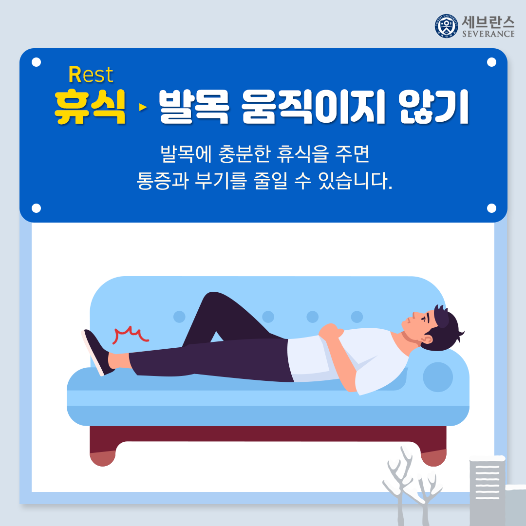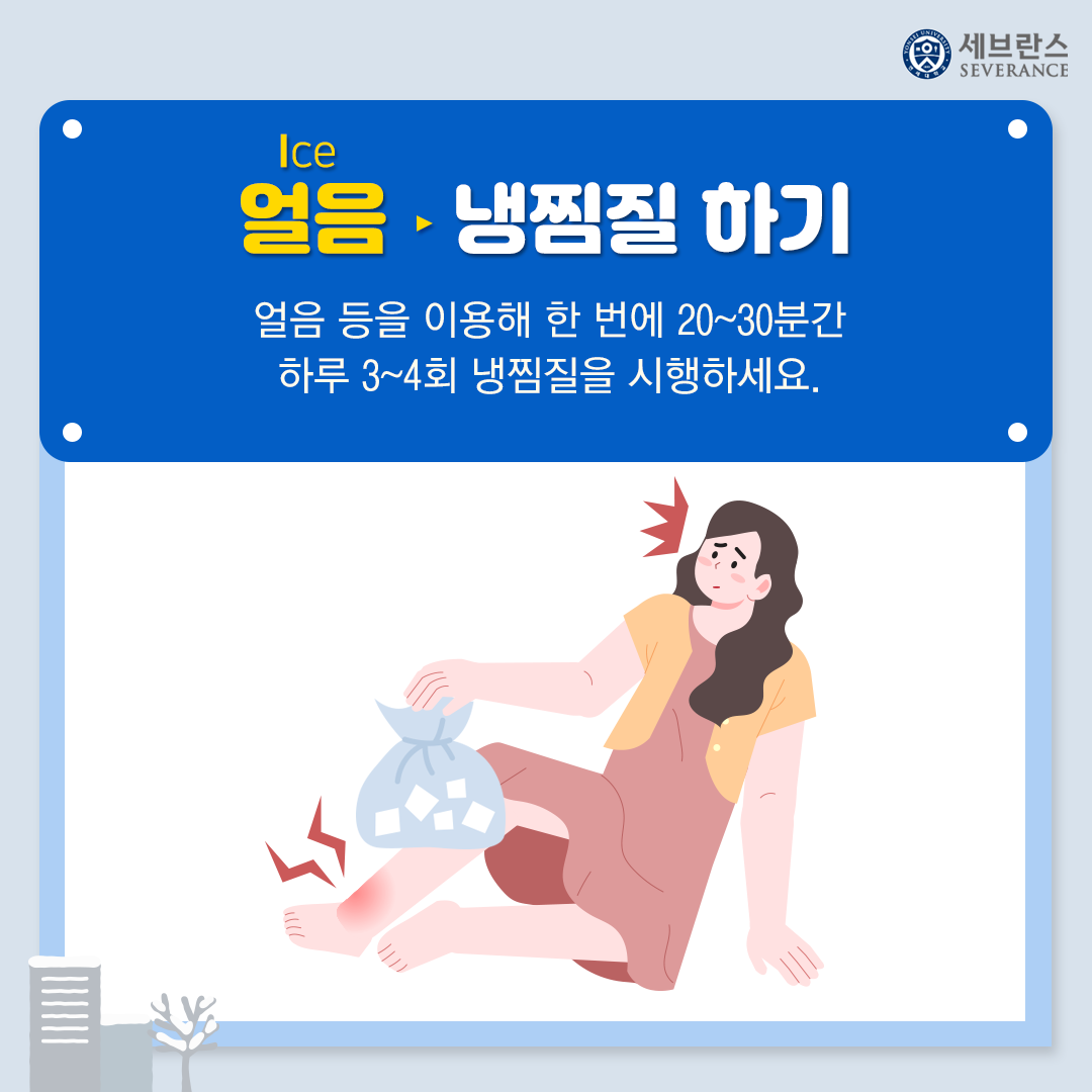 발목을 다쳤을 땐 첫 24시간 동안의 응급처치가 중요합니다. 발목 손상 시, RICE(Rest= 휴식, Ice=얼음찜질, Compression=압박, Elevation= 거상)를 기억하세요!